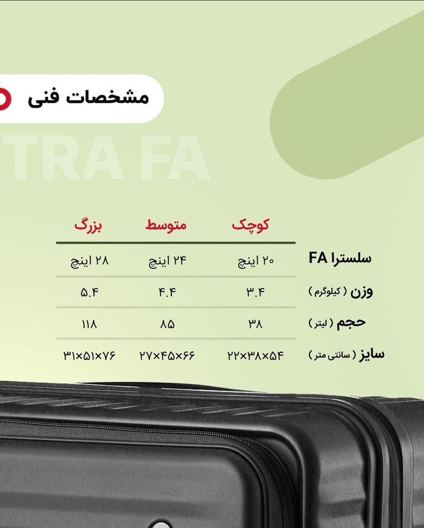 چمدان سِلِسترا FA با طراحی ایتالیایی شیک و برازنده، ساخته شده از پلی کربنات ۱۰۰٪ خالص بایِرِ آلمان، دارای چهار چرخ دوبل هینومتو ژاپن با گردش ۳۶۰ درجه، و قابلیت چیدمان و دسترسی راحت‌تر با طراحی متفاوت. همچنین دارای جای مخصوص برای لپ‌تاپ و تبلت، و پورت USB برای شارژ موبایل، زیپ افزایش دهنده ظرفیت، زیپ دوبل و ضدسرقت، و قفل بین‌المللی TSA می‌باشد.