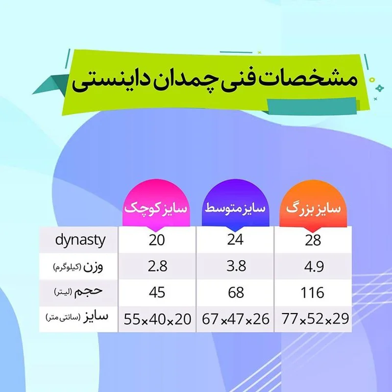 - سایز کوچک (۲۰ اینچ): 20*40*55 سانتیمتر، حجم 45 لیتر، وزن 2/8 کیلوگرم