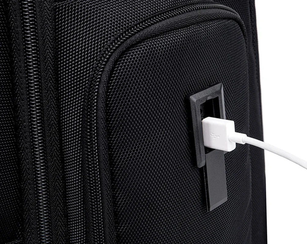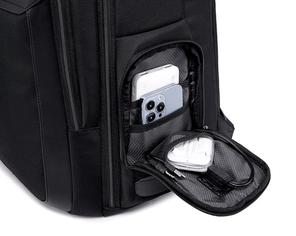 - 2 جیب جانبی دارد، یک جیب دارای USB، درگاه گوشی و دو نگهدارنده برای پاور بانک دارد.