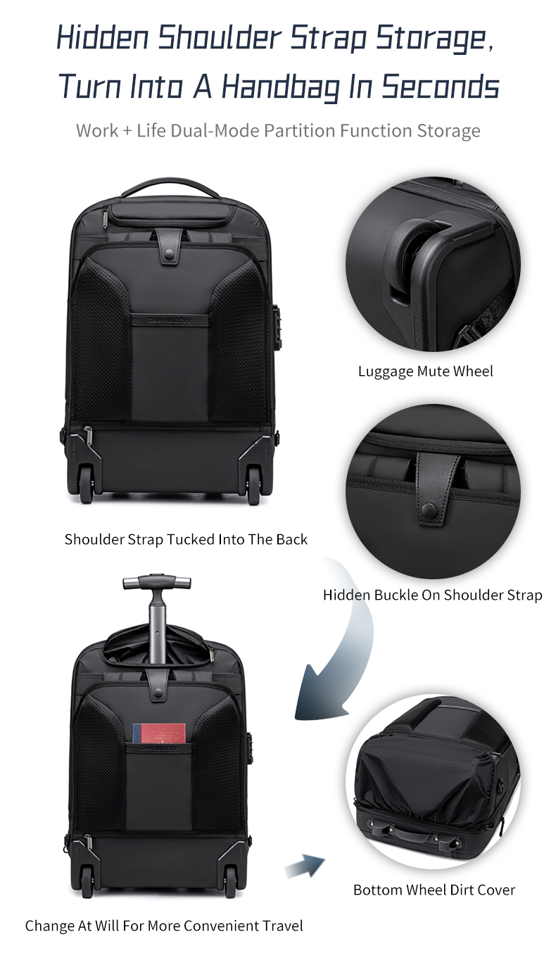 این کیف چندمنظوره بهعنوان کولهپشتی و کیف چرخدار قابل استفاده است و انعطافپذیری و راحتی را در سفر به شما ارائه میدهد. دسته چرخدار، بندهای شانه و چرخها به راحتی قابل مخفی شدن هستند که تجربه استفاده بهتری را فراهم میکند.