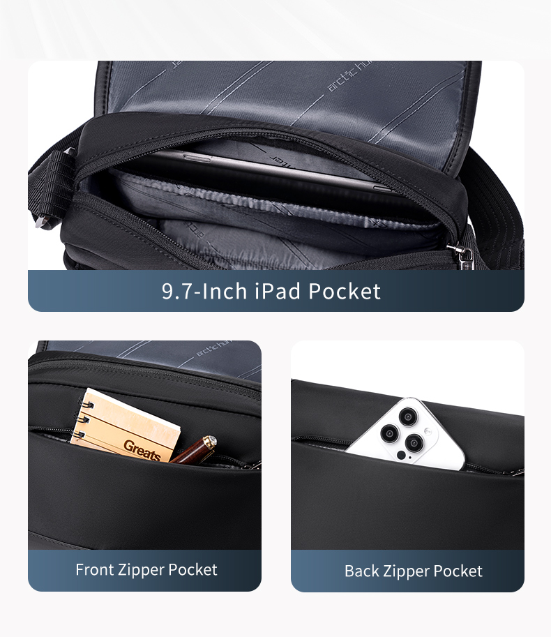 این کیف دارای سه قسمت مرتب است. بخش اصلی شامل یک جیب مخصوص گوشی و یک بخش زیپی برای اشیاء با ارزش است، در حالی که بخشهای جلویی و پشتی دسترسی سریع به وسایل روزمره مانند پاوربانک، هندزفری، عینک، دفترچههای A5، خودکار و شارژرها را فراهم میکنند.