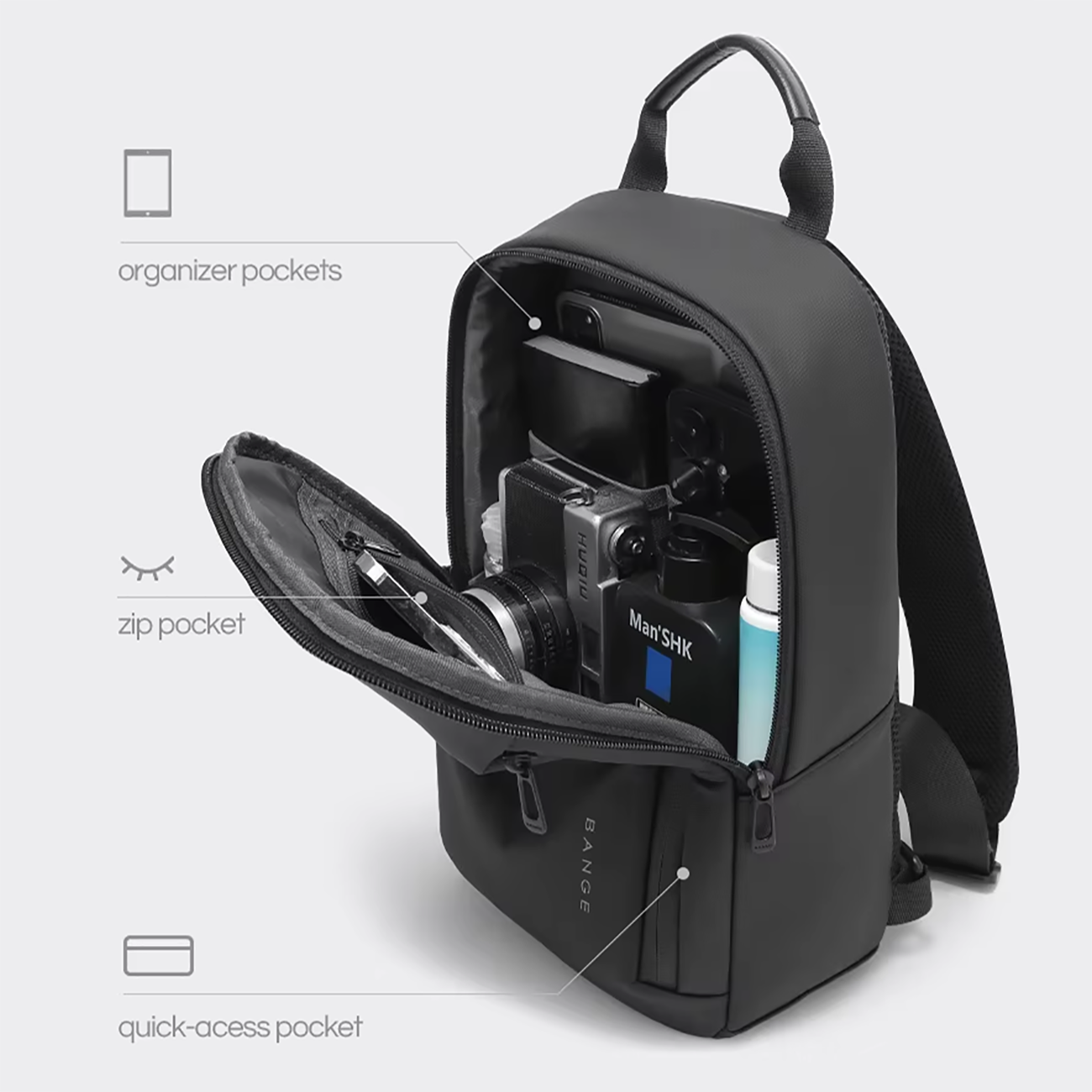 بنج برای حمل راحتتر و فشار نیامدن به شانهها در تولید کوله پشتی، بند پهن و مقاوم برای آن درنظر گرفته است که با وجود سگکی با دوام، قابل تنظیم بوده و به راحتی برای مطابقت با نیاز و هدف شما سفارشی می شود. بند شانه را می توانید به سمت چپ و راست تغییر دهید.با وجود این بند، کیف را میتوان هم روی سینه یا پشت و هم روی شانه استفاده کرد.